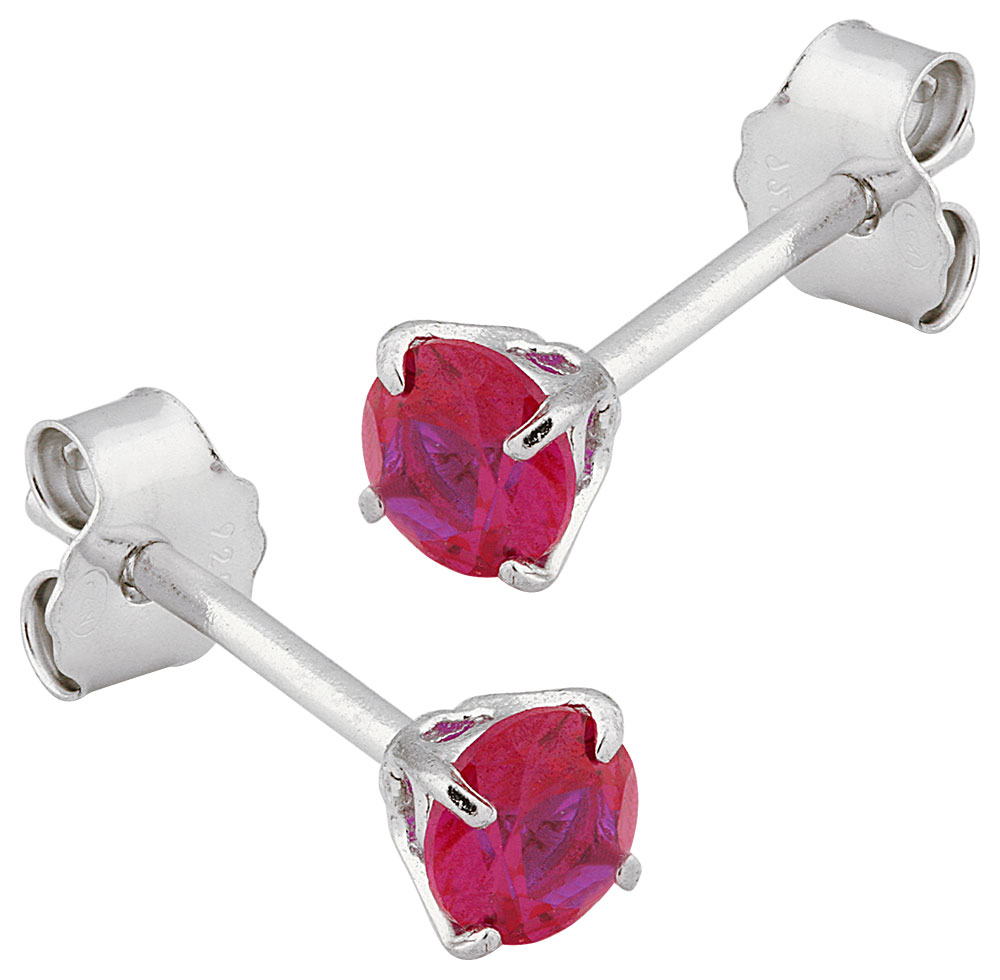 Boucles d'oreille en argent rhodié 925 millièmes serties d'une pierre de synthèse rouge de quatre millimètres de diamètre.