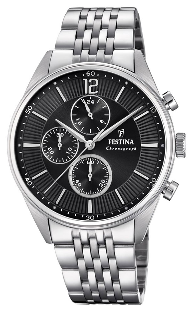 Chronographe pour homme de la collection Festina en acier inoxydable avec un fond de cadran noir.
