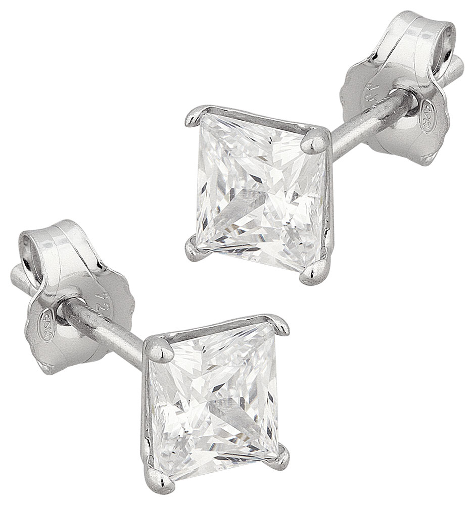 Boucles d'oreille en argent rhodié 925 millièmes serties d'un oxyde de zirconium carré de cinq millimètres de largeur.