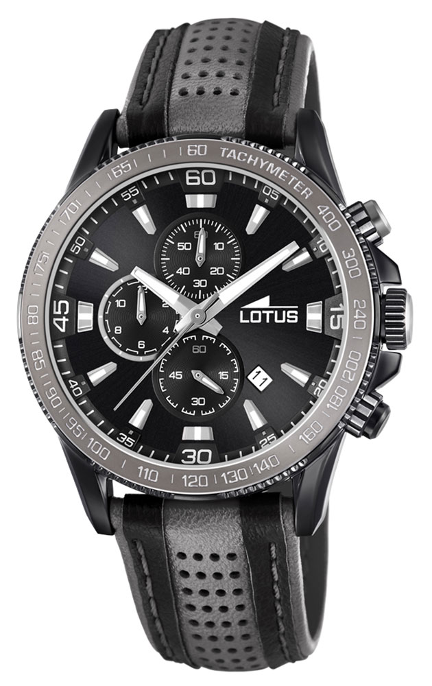 Chronographe pour homme de la collection Lotus en acier inoxydable sur un bracelet en cuir gris et noir.