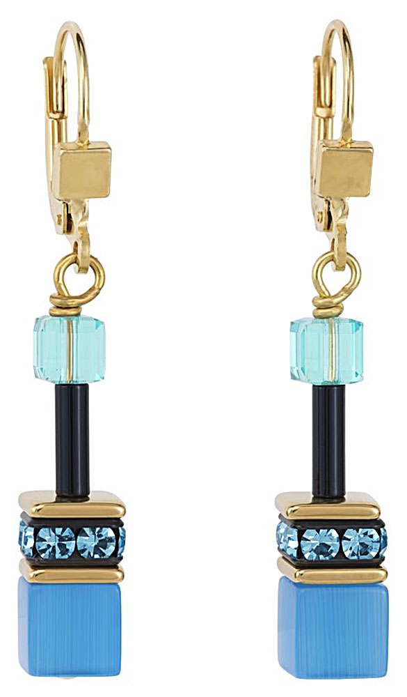 Boucles d'oreille dormeuses de la collection Coeur de Lion en métal doré, cristaux de Swarovski et verre à dominante bleue.