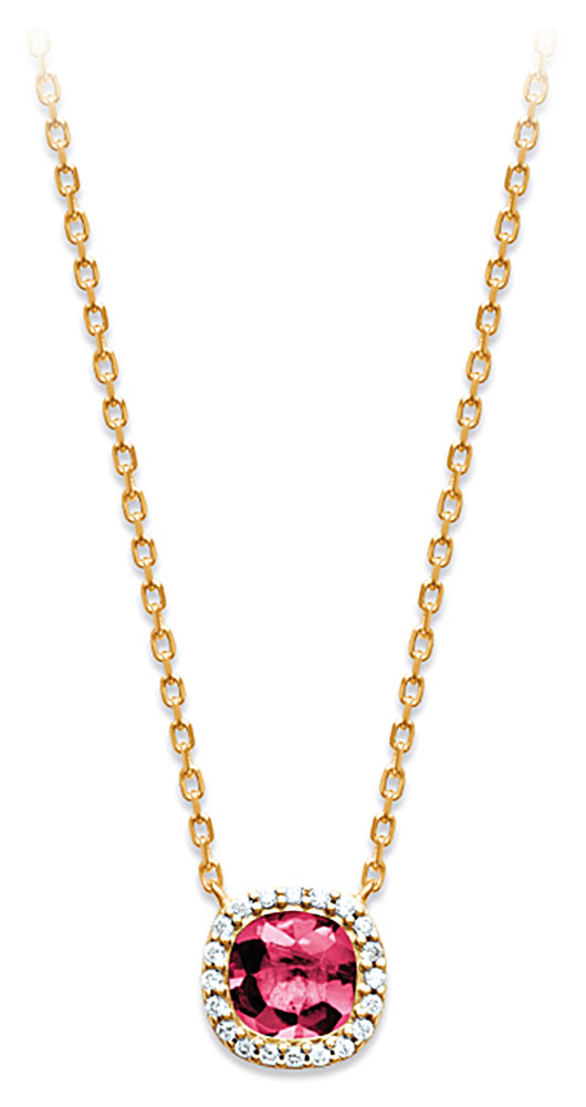Collier en plaqué or jaune serti d'une pierre de synthèse rouge et d'oxydes de zirconium.