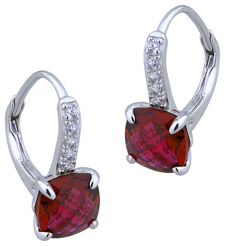 Boucles d'oreille dormeuses en argent rhodié 925 millièmes serties d'une pierre de synthèse rouge et d'oxydes de zirconium.