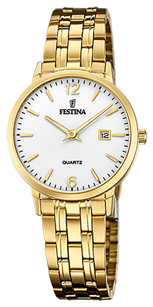 Montre pour femme de la collection Festina en métal doré avec un fond de cadran blanc.