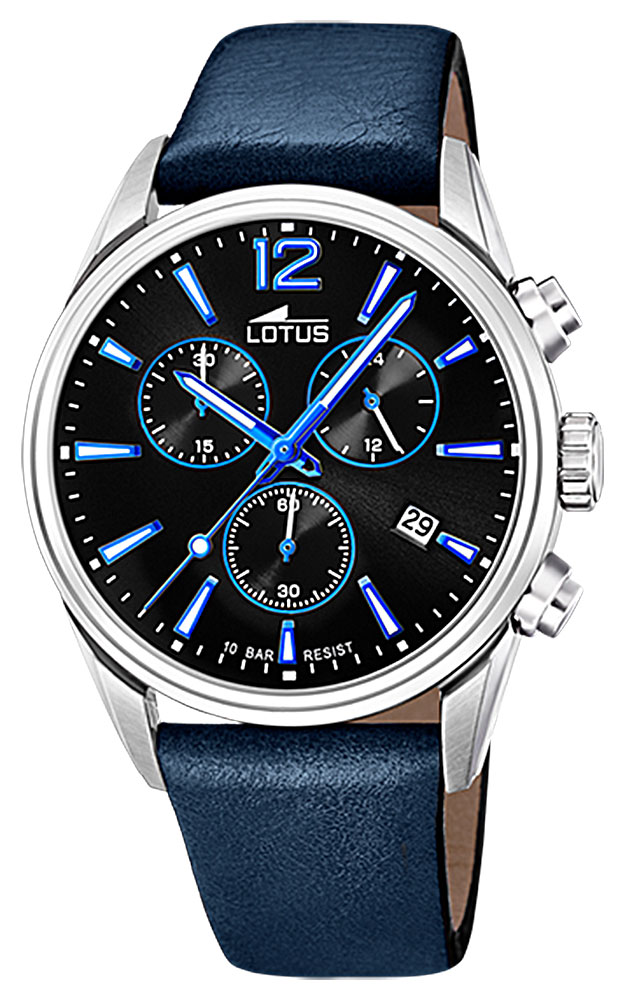 Chronographe pour homme de la collection Lotus en acier inoxydable sur un bracelet en cuir bleu foncé.