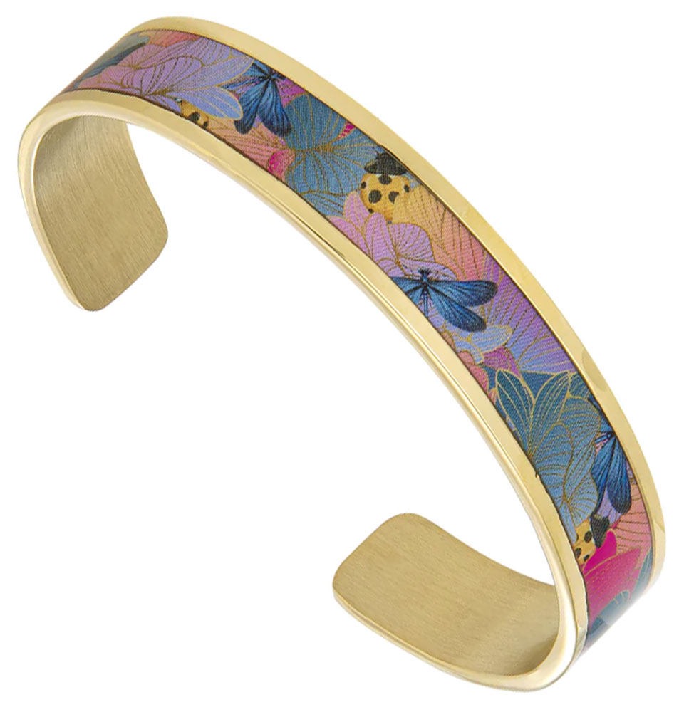 Bracelet manchette ouverte de la collection Louise Garden en métal doré représentant des libellules.