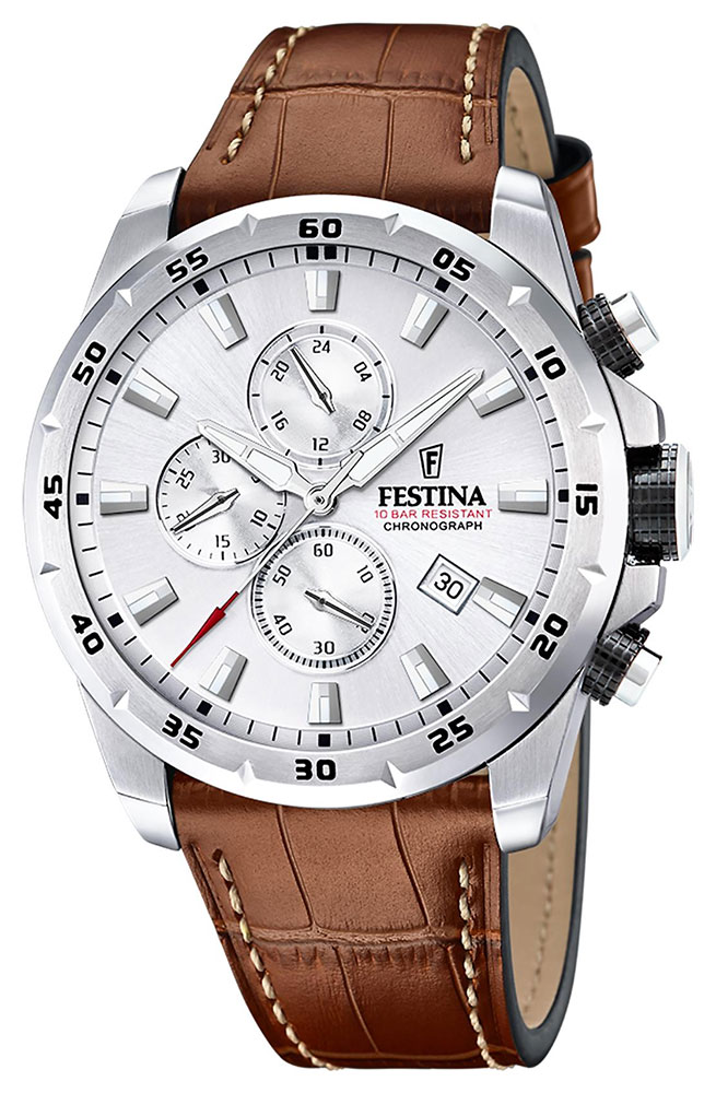 Chronographe pour homme de la collection Festina en acier inoxydable sur un bracelet en cuir marron.