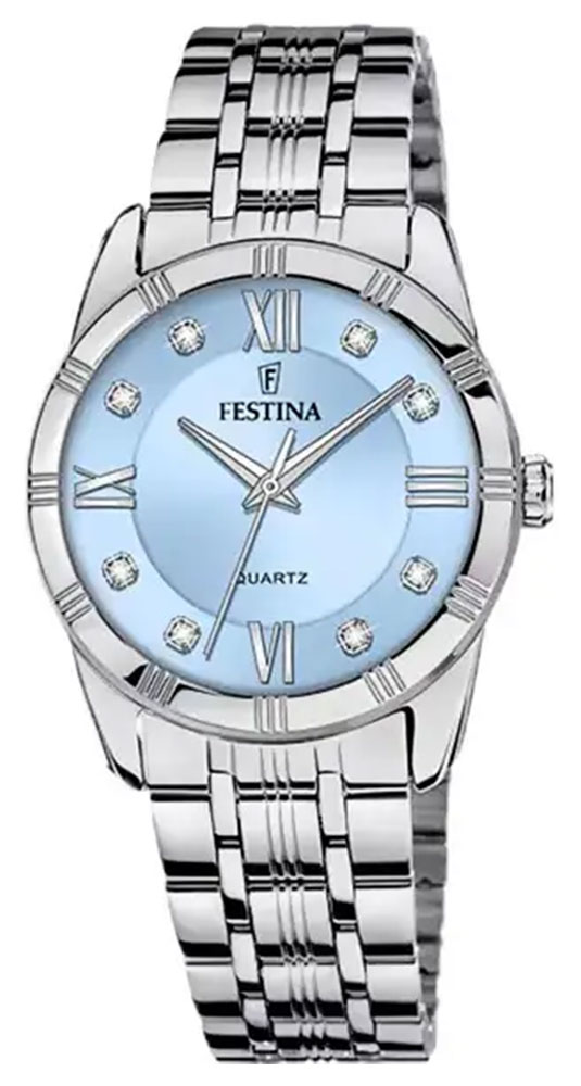 Montre pour femme de la collection Festina en acier inoxydable avec un fond de cadran bleu.