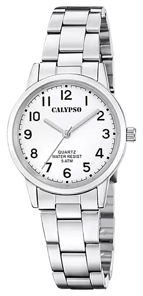 Montre pour femme de la collection Calypso en acier inoxydable avec un fond de cadran blanc.