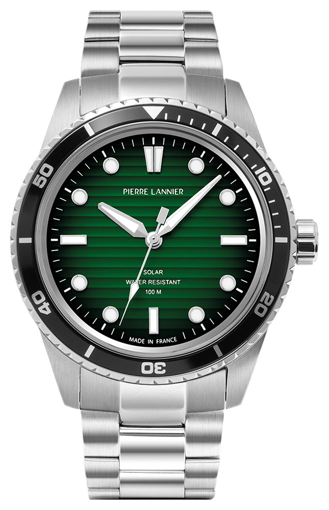 Montre solaire pour homme de la collection Pierre Lannier en acier inoxydable avec un fond de cadran vert.