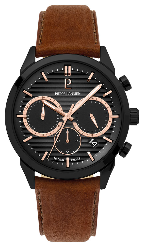 Chronographe pour homme de la collection Pierre Lannier en acier noir sur un bracelet en cuir marron.