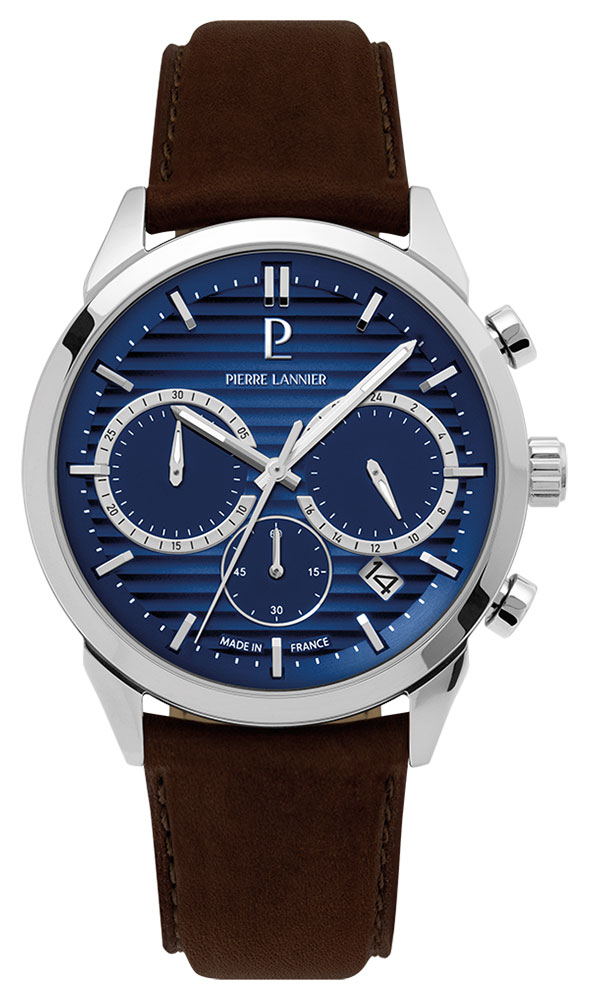 Chronographe pour homme de la collection Pierre Lannier en acier inoxydable sur un bracelet en cuir marron.