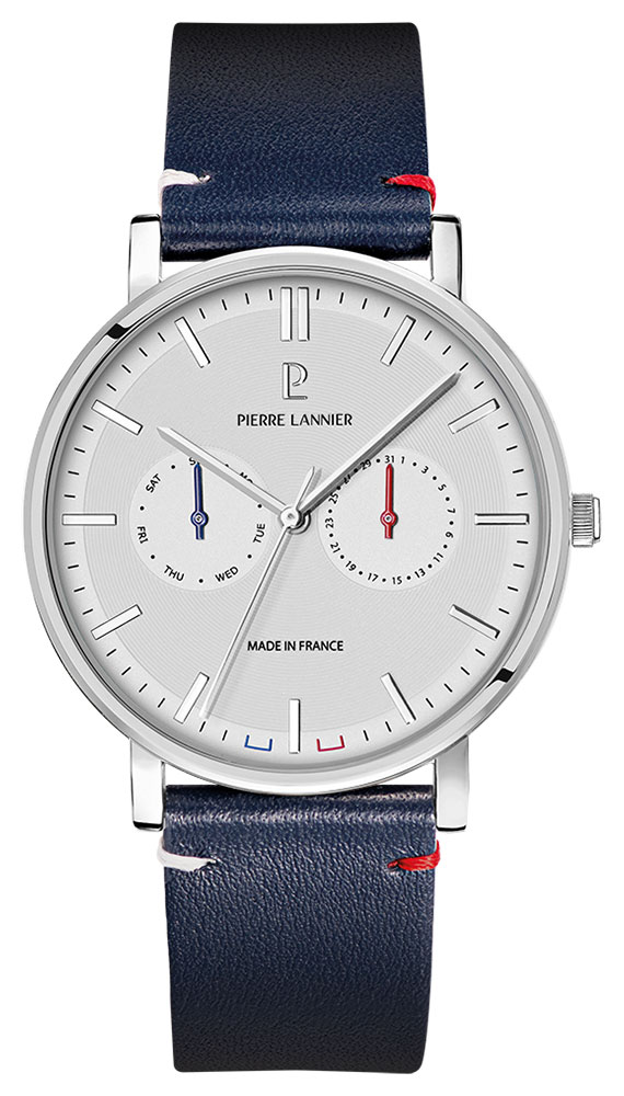 Montre pour homme de la collection Pierre Lannier en acier inoxydable sur un bracelet en cuir bleu.
