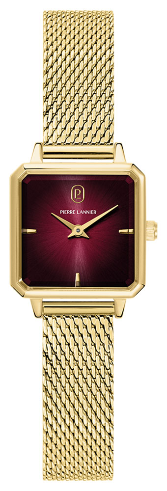 Montre pour femme de la collection Pierre Lannier en métal doré avec un fond de cadran bordeaux.