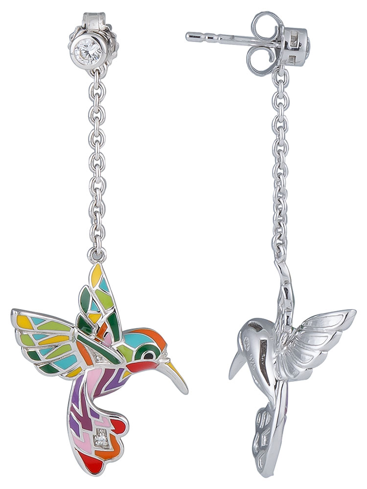 Boucles d'oreille pendantes de la collection Una Storia en argent 925 millièmes et laque représentant un oiseau.