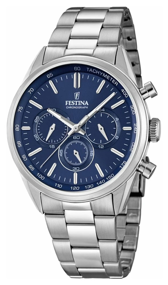 Chronographe pour homme de la collection Festina en acier inoxydable avec un fond de cadran bleu.