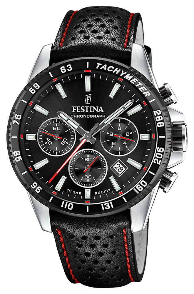 Chronographe pour homme de la collection Festina en acier inoxydable sur un bracelet en cuir noir.
