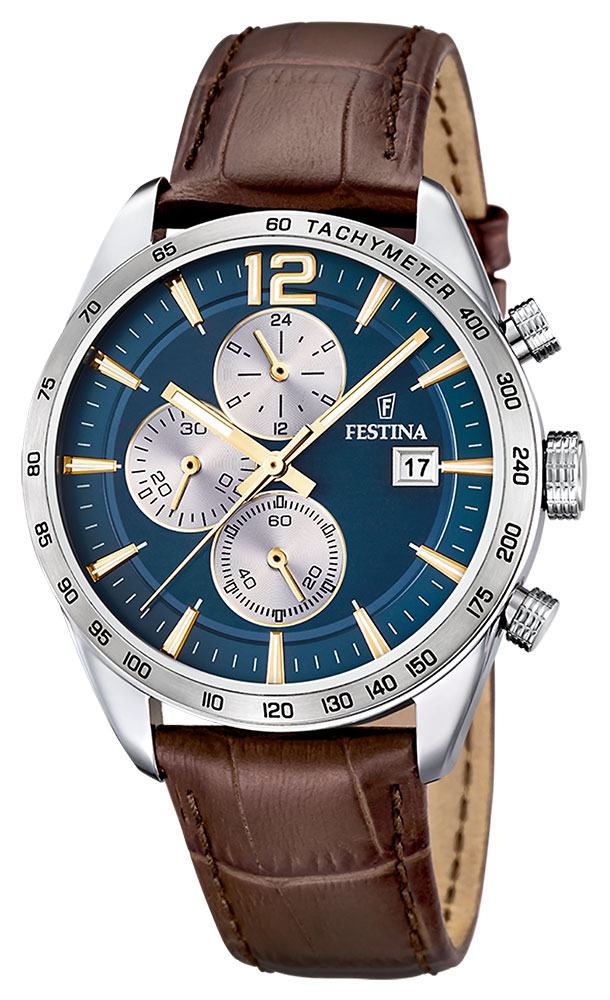 Chronographe pour homme de la collection Festina en acier inoxydable sur un bracelet en cuir marron.