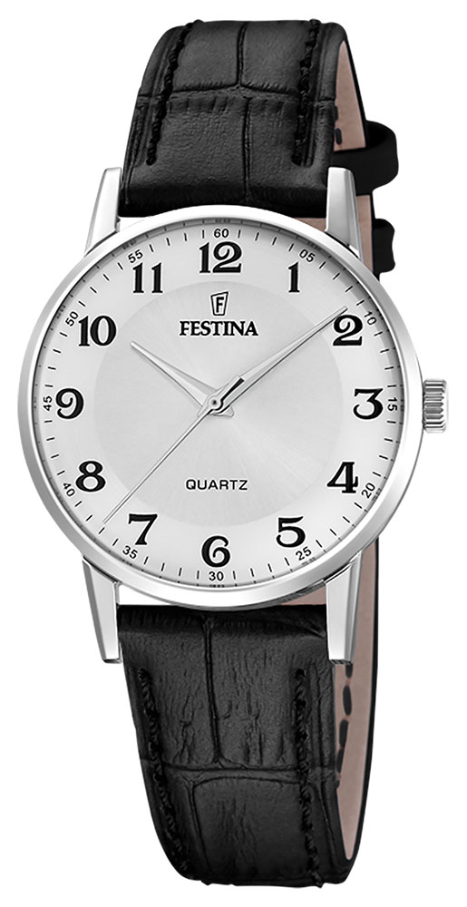Montre pour femme de la collection Festina en acier inoxydable sur un bracelet en cuir noir.