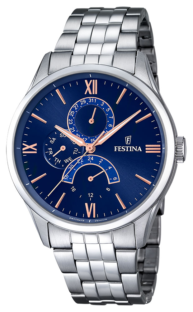 Montre pour homme de la collection Festina en acier inoxydable avec un fond de cadran bleu.