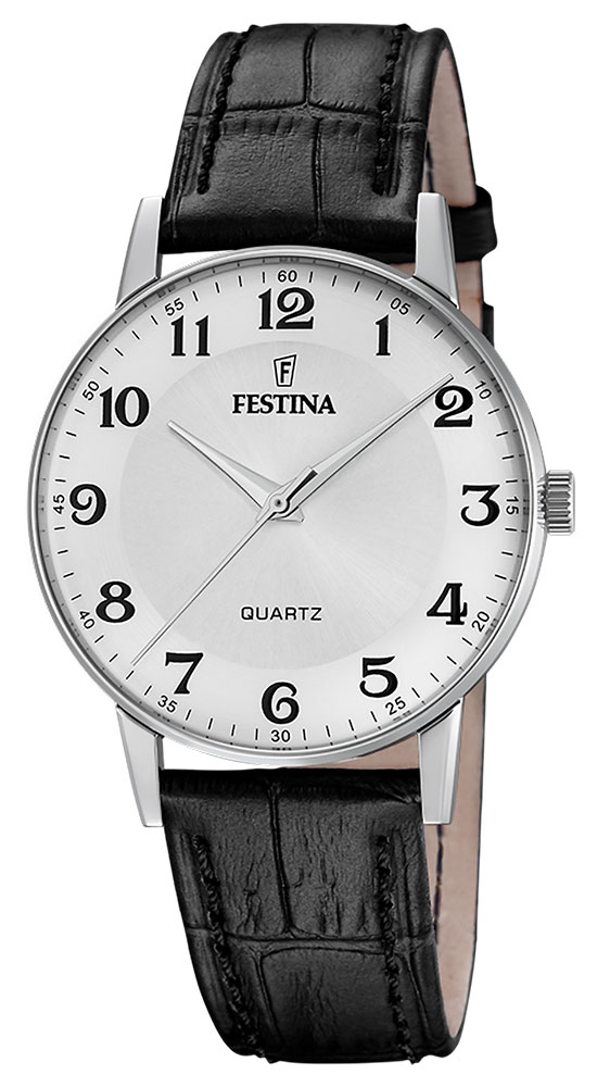 Montre pour homme de la collection Festina en acier inoxydable sur un bracelet en cuir noir.