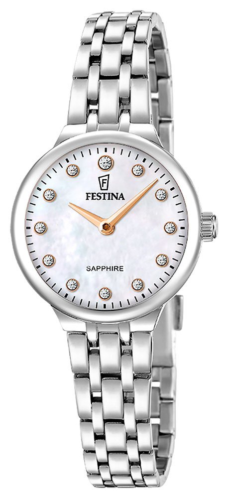 Montre pour femme de la collection Festina en acier inoxydable avec un fond de cadran nacré.