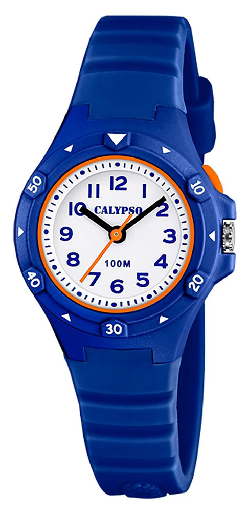 Montre pour enfant de la collection Calypso en résine bleue avec un fond de cadran blanc.