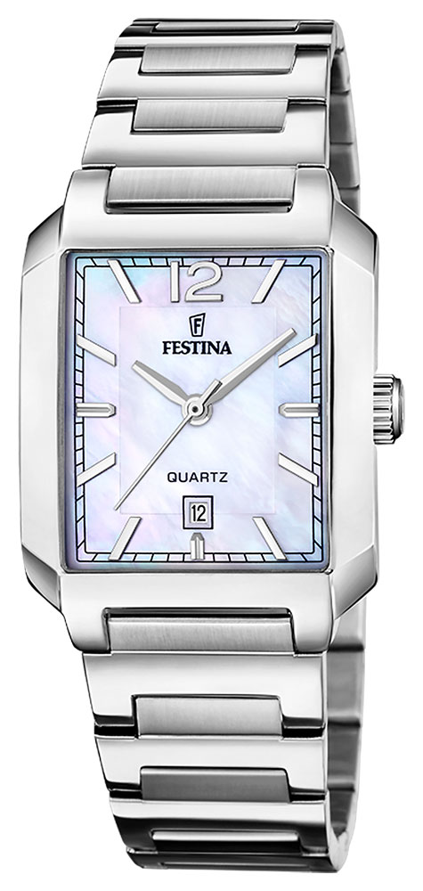 Montre pour femme de la collection Festina en acier inoxydable avec un fond de cadran nacré.