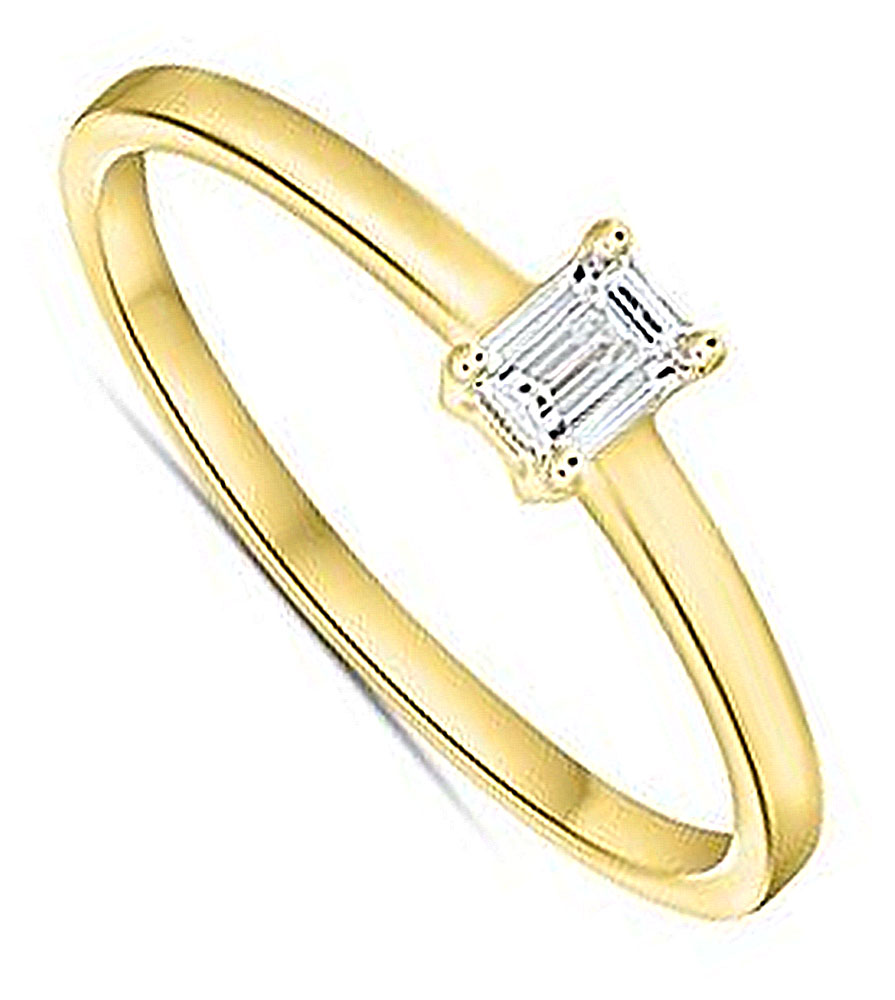 Solitaire en or jaune 750 millièmes serti d'un diamant taille baguette.