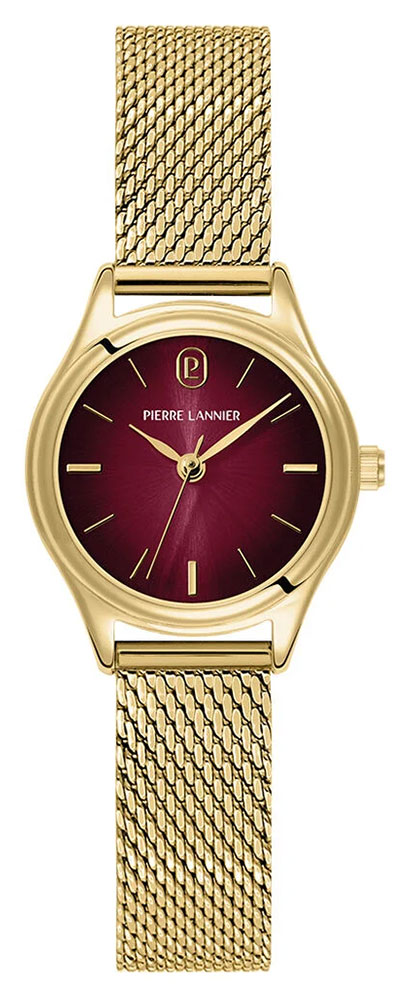 Montre pour femme de la collection Pierre Lannier en métal doré avec un fond de cadran couleur bordeaux.