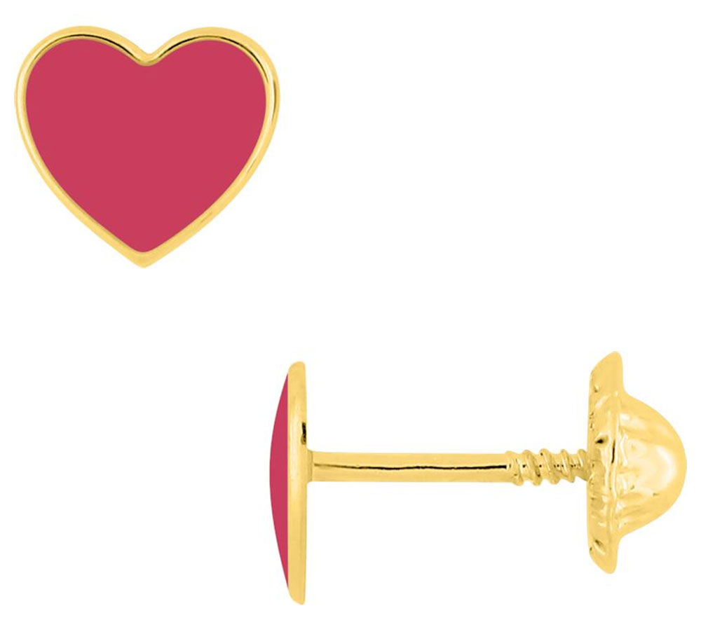 Boucles d'oreille en or jaune 375 millièmes et laque rose représentant un coeur.