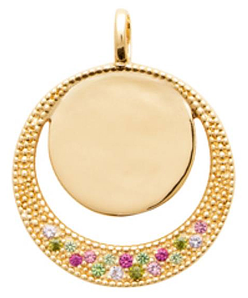 Médaille en plaqué or jaune sertie de pierres de synthèse.