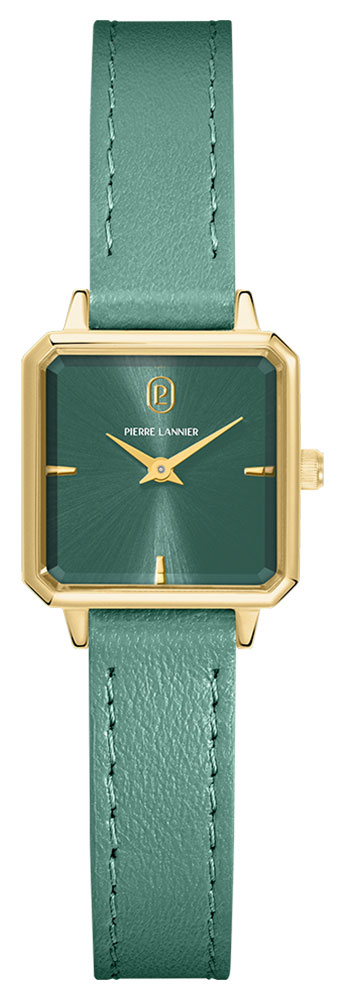 Montre pour femme de la collection Pierre Lannier en métal doré sur un bracelet en cuir vert.