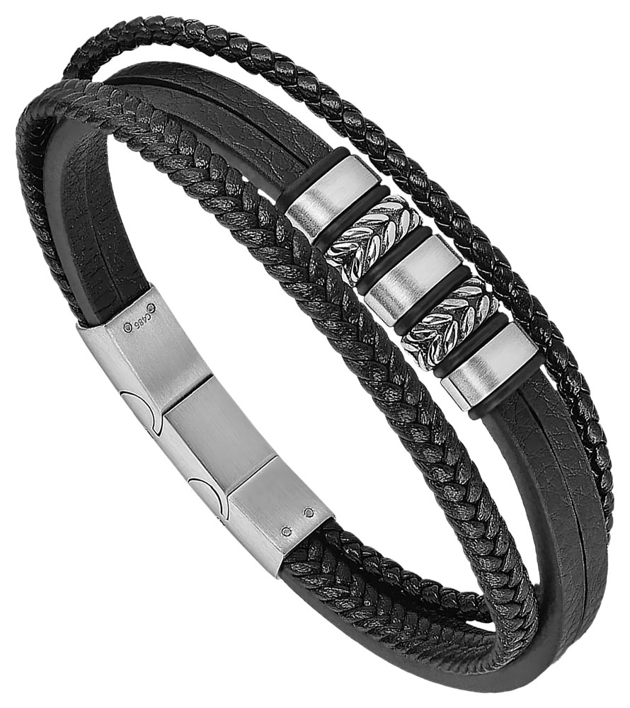 Bracelet pour homme de la collection Lotus en cuir noir et acier inoxydable.