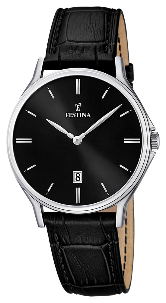 Montre pour homme de la collection Festina en acier inoxydable sur un bracelet en cuir noir.