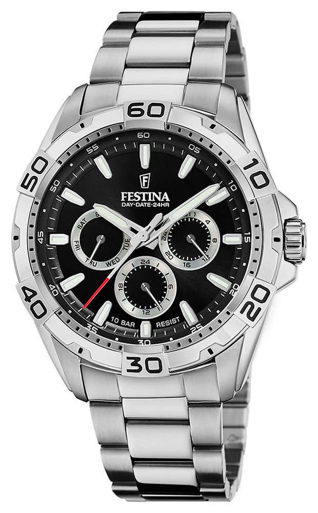 Montre pour homme de la collection Festina en acier inoxydable avec un fond de cadran noir.
