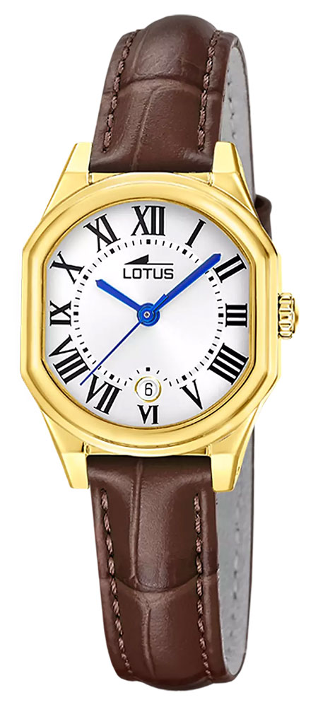 Montre pour femme de la collection Lotus en métal doré sur un bracelet en cuir marron.