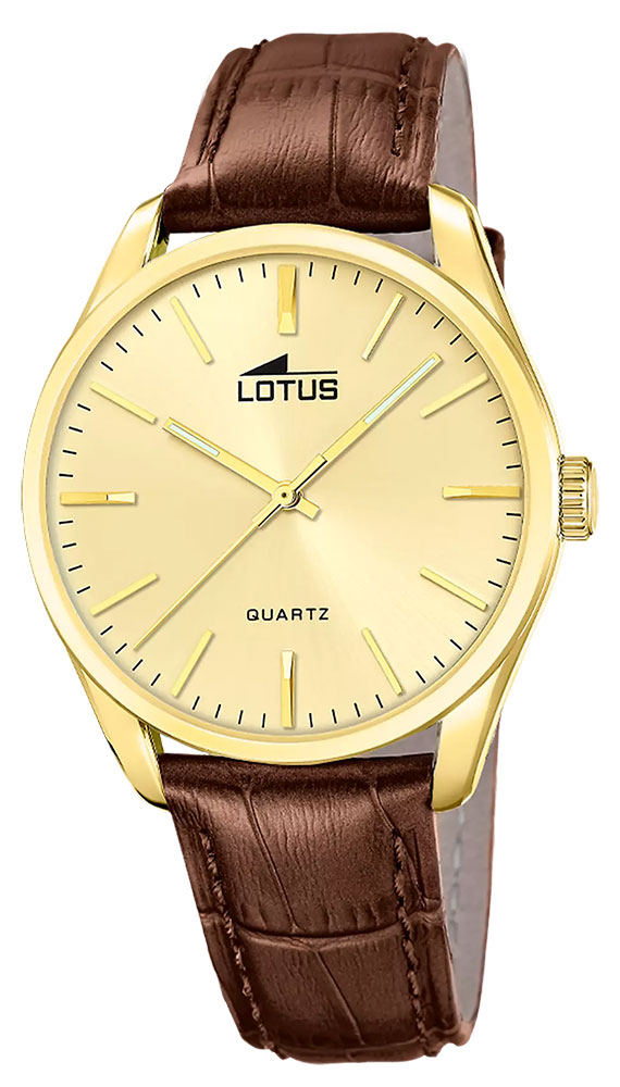 Montre pour homme de la collection Lotus en métal doré sur un bracelet en cuir marron.
