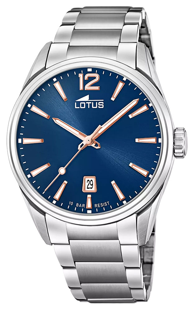 Montre pour homme de la collection Lotus en acier inoxydable avec un fond de cadran bleu.