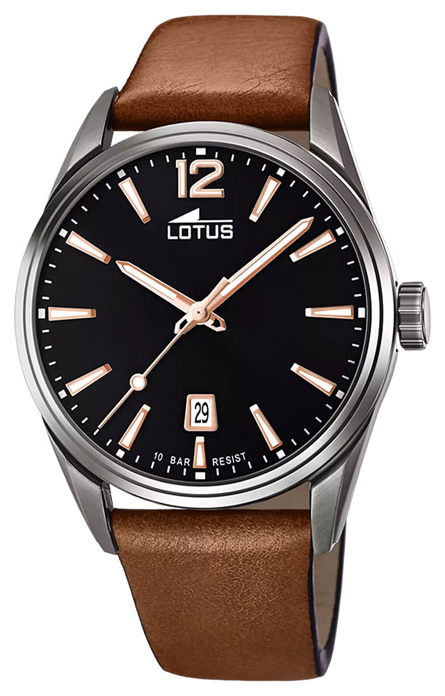 Montre pour homme de la collection Lotus en acier gris foncé sur un bracelet en cuir marron.