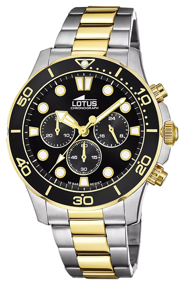 Chronographe de la collection Lotus en acier bicolore avec un fond de cadran noir.
