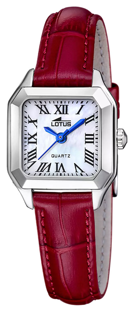 Montre pour femme de la collection Lotus en acier inoxydable sur un bracelet en cuir bordeaux.