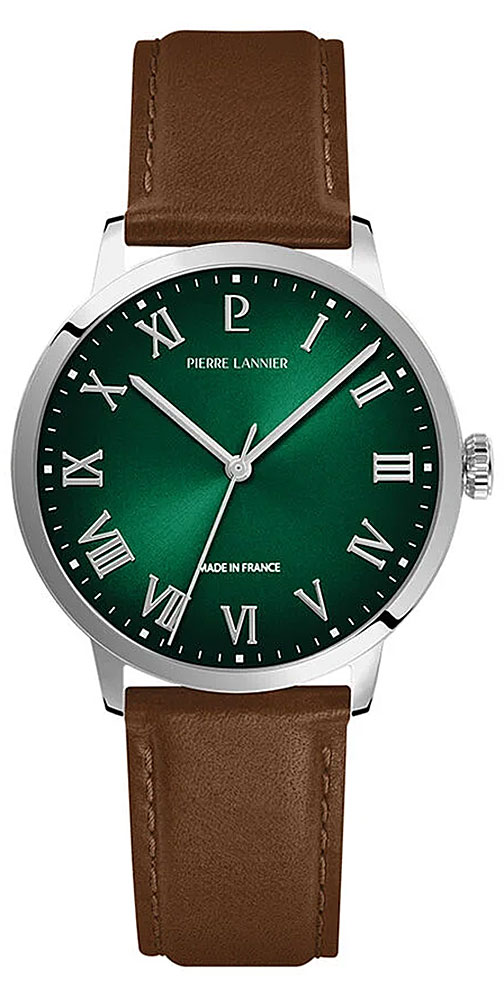 Montre pour homme de la collection Pierre Lannier en acier inoxydable sur un bracelet en cuir marron.
