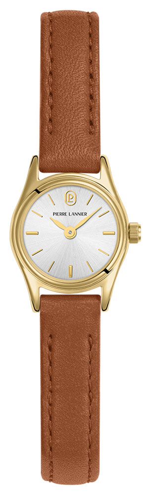 Montre pour femme de la collection Pierre Lannier en métal doré sur un bracelet en cuir marron.