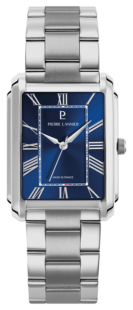 Montre pour homme de la collection Pierre Lannier en acier inoxydable avec un fond de cadran bleu.