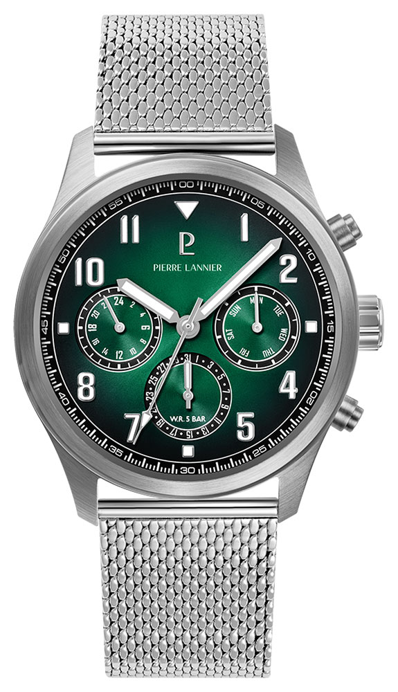 Chronographe pour homme de la collection Pierre Lannier en acier inoxydable avec un fond de cadran vert.