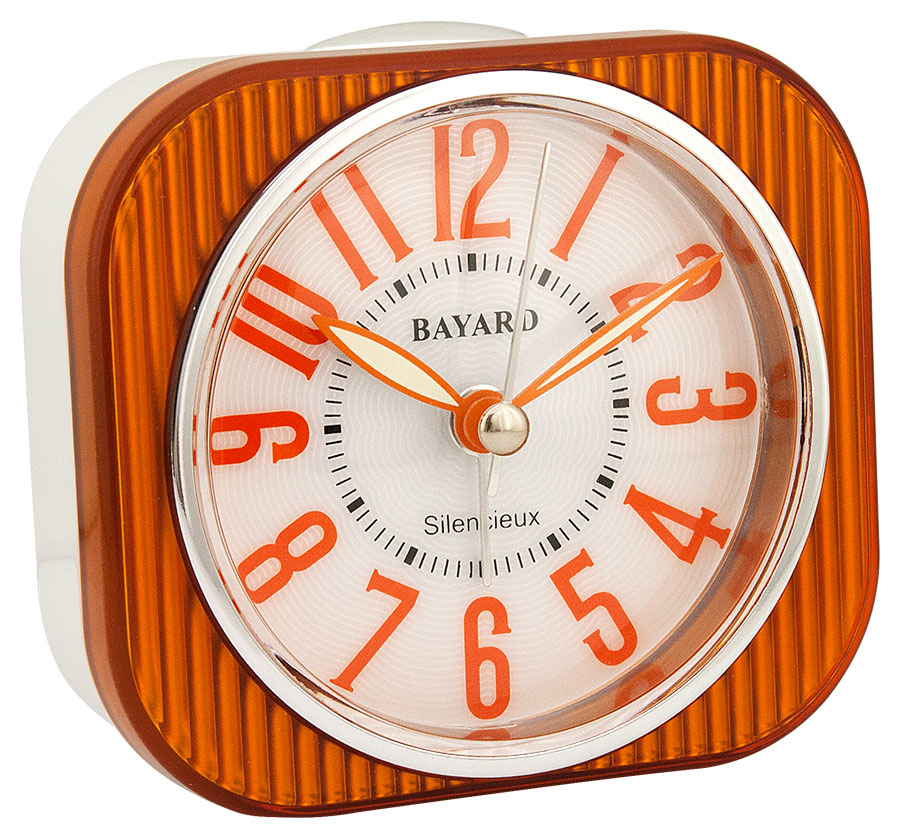 Réveil de la collection Bayard en résine orange et blanche. Mouvement silencieux.